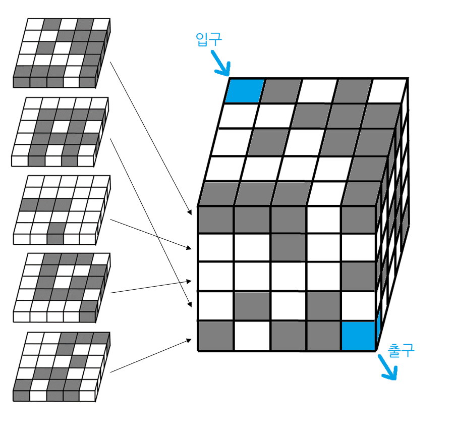 - 회전을 완료한 후 참가자는 판 5개를 쌓는다. 판을 쌓는 순서는 참가자가 자유롭게 정할 수 있다. 이렇게 판 5개를 쌓아 만들어진 5×5×5 크기의 큐브가 바로 참가자를 위한 미로이다. 이 때 큐브의 입구는 정육면체에서 참가자가 임의로 선택한 꼭짓점에 위치한 칸이고 출구는 입구와 면을 공유하지 않는 꼭짓점에 위치한 칸이다.