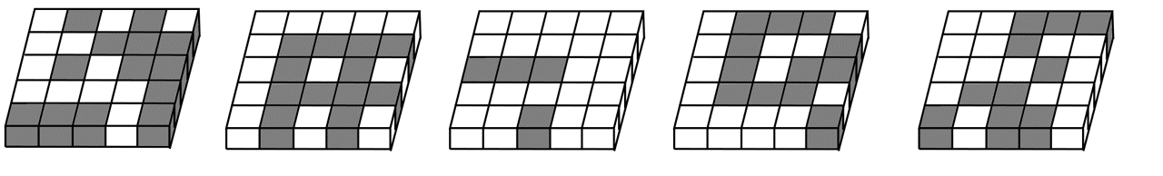- 5×5 크기의 판이 5개 주어진다. 이중 일부 칸은 참가자가 들어갈 수 있고 일부 칸은 참가자가 들어갈 수 없다. 그림에서 하얀 칸은 참가자가 들어갈 수 있는 칸을, 검은 칸은 참가자가 들어갈 수 없는 칸을 의미한다.
