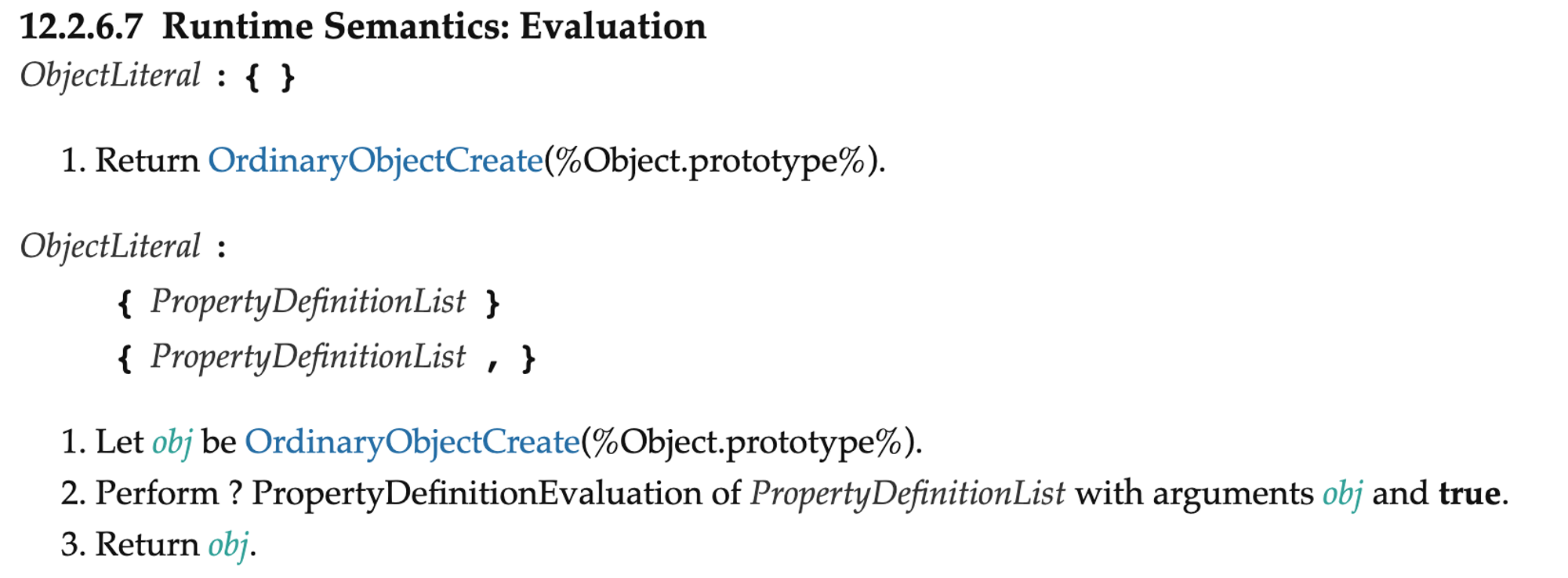 객체 리터럴이 평가될 때에도 위와 같이 OrdinaryObjectCreate 를 호출하여 빈 객체를 생성하고 프로퍼티 주기를 추가하도록 정의 되어 있다.