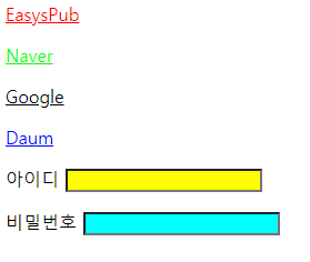 <!DOCTYPE html> <html lang="en"> <head> <meta charset="UTF-8"> <meta http-equiv="X-UA-Compatible" content="IE=edge"> <meta name="viewport" content="width=device-width, initial-scale=1.0"> <title>Document</title> <script src="https://cdnjs.cloudflare.com/ajax/libs/jquery/3.7.0/jquery.js" integrity="sha512-8Z5++K1rB3U+USaLKG6oO8uWWBhdYsM3hmdirnOEWp8h2B1aOikj5zBzlXs8QOrvY9OxEnD2QDkbSKKpfqcIWw==" crossorigin="anonymous" referrerpolicy="no-referrer"></script> <script> $(function(){ $("#wrap a[href^=https]").css("color", "#0f0") $("#wrap a[target]").css("color", "#f00") $("#wrap a[href$=net]").css("color", "#00f") $("#wrap a[href*=google]").css("color", "#000") $("#member_f :text").css({"background-color" : "#ff0"}) $("#member_f :password").css("background-color", "#0ff") //반드시 아이디(띄고):password로 적어줘야함. }) </script> </head> <body> <div id="wrap"> <p> <a href="https://easyspub.fco.kr" target="_blank">EasysPub</a> </p> <p> <a href="https://naver.com">Naver</a> </p> <p> <a href="https://google.co.kr">Google</a> </p> <p> <a href="https://daum.net">Daum</a> </p> </div> <form action="#"method=get id="member_f"> <p> <label for="user_id">아이디</label> <input type="text" name="user_id" id="user_id"> </p> <p> <label for="user_pw">비밀번호</label> <input type="password" name="user_pw" id="user_pw"> </p> </form> </body> </html>