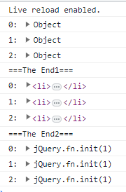 매개변수1, 매개변수2에는 배열에 저장된 요소와 인덱스 값이 배열에 오름차순으로 대입됩니다. $("요소").each(function(매개변수1, 매개변수2) {}) $.each($("요소"), function(매개변수1, 매개변수2) {}) $(this)에는 배열에 저장된 요소가 오름차순으로 대입됩니다. $("요소").each(function() {$(this)}) $.each($("요소"), function() {$(this)}) 오름차순 대입 = 인덱스 순서로 대입 0, 1, 2, ...<!DOCTYPE html> <html lang="en"> <head> <meta charset="UTF-8"> <meta http-equiv="X-UA-Compatible" content="IE=edge"> <meta name="viewport" content="width=device-width, initial-scale=1.0"> <title>Document</title> <script src="https://cdnjs.cloudflare.com/ajax/libs/jquery/3.7.0/jquery.js" integrity="sha512-8Z5++K1rB3U+USaLKG6oO8uWWBhdYsM3hmdirnOEWp8h2B1aOikj5zBzlXs8QOrvY9OxEnD2QDkbSKKpfqcIWw==" crossorigin="anonymous" referrerpolicy="no-referrer"></script> <script> $(function() { var obj = [{ "area" : "서울" }, { "area" : "부산" }, { "area" : "전주" }] $(obj).each(function(i, o) { console.log(i + ":", o) }) console.log("===The End1===") $.each($("#menu2 li"), function(i, o) { console.log(i + ":", o) }) console.log("===The End2===") $.each($("#menu2 li"), function(i) { console.log(i + ":", $(this)) }) }) </script> </head> <body> <h1>탐색 선택자</h1> <ul id="menu1"> <li>내용1-1</li> <li>내용1-2</li> <li>내용1-3</li> </ul> <ul id="menu2"> <li>내용2-1</li> <li>내용2-2</li> <li>내용2-3</li> </ul> </body> </html>