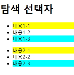$("요소:first-of-type") $("요소:last-of-type")<!DOCTYPE html> <html lang="en"> <head> <meta charset="UTF-8"> <meta http-equiv="X-UA-Compatible" content="IE=edge"> <meta name="viewport" content="width=device-width, initial-scale=1.0"> <title>Document</title> <script src="https://cdnjs.cloudflare.com/ajax/libs/jquery/3.7.0/jquery.js" integrity="sha512-8Z5++K1rB3U+USaLKG6oO8uWWBhdYsM3hmdirnOEWp8h2B1aOikj5zBzlXs8QOrvY9OxEnD2QDkbSKKpfqcIWw==" crossorigin="anonymous" referrerpolicy="no-referrer"></script> <script> $(function(){ $("li:first-of-type").css({ "background-color":"#ff0" }) $("li:last-of-type").css({ "background-color":"#0ff" }) }) </script> </head> <body> <h1>탐색 선택자</h1> <ul> <li>내용1-1</li> <li>내용1-2</li> <li>내용1-3</li> </ul> <ul> <li>내용2-1</li> <li>내용2-2</li> <li>내용2-3</li> </ul> </body> </html>