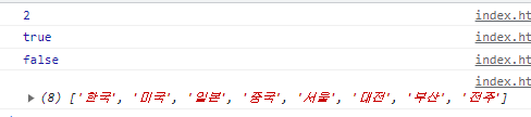 $.inArray(data, Array, start index) $.isArray(object) $.merge(Array1, Array2)<script> $(function() { const arr1 = ["서울", "대전", "부산", "전주"] const arr2 = ["한국", "미국", "일본", "중국"] const obj = { "name" : "정부장", "area" : "서울" } const idxNum = $.inArray("부산", arr1); console.log(idxNum); const okArray1 = $.isArray(arr1) const okArray2 = $.isArray(obj); console.log(okArray1) console.log(okArray2) $.merge(arr2, arr1); console.log(arr2) }) </script>