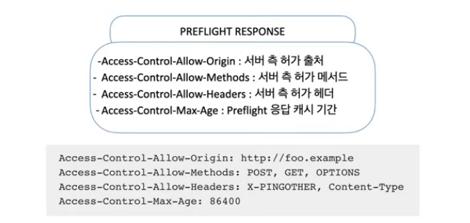 * Acess-Control-Max-Age : perflight는 예비 요청, 본 요청 총 두번의 요청을 보내는데 이게 리소스적으로 좋지 않기 때문에 브라우저는 preflight 응답에 대해 캐싱을 해두고 다음에 같은 요청이오면 사전 요청을 미리 보내지 않고 본 요청으로 넘어갈 수 있다. 특징)