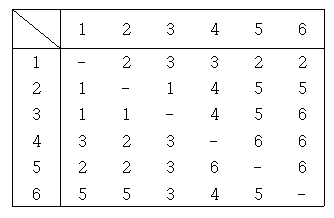 예시된 그래프에서 굵게 표시된 1, 2, 3, 4, 5, 6은 집하장을 나타낸다. 정점간의 간선은 두 집하장간에 화물 이동이 가능함을 나타내며, 가중치는 이동에 걸리는 시간이다. 이로부터 얻어내야 하는 경로표는 다음과 같다.
