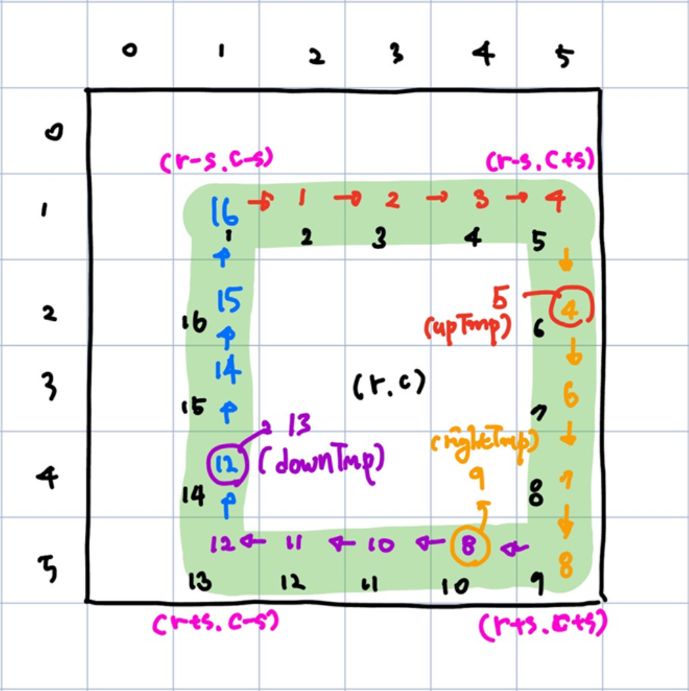 public static int[][] copyMap() { int[][] tmp = new int[N][M]; for(int i=0; i<N; i++) { for(int j=0; j<M; j++) { tmp[i][j] = map[i][j]; } } return tmp; }public static void doCycle(int[] arr) { int[][] tmp = copyMap(); for(int k=0; k<K; k++) { int r = cycle[arr[k]][0]; int c = cycle[arr[k]][1]; int S = cycle[arr[k]][2]; for(int s=1; s<=S; s++) { //위 int upTmp = tmp[r-s][c+s]; for(int y = c+s; y > c-s; y--) { tmp[r-s][y] = tmp[r-s][y-1]; } //오른쪽 int rightTmp = tmp[r+s][c+s]; for(int x = r+s; x > r-s; x--) { tmp[x][c+s] = tmp[x-1][c+s]; } tmp[r-s+1][c+s] = upTmp; //아래 int leftTmp = tmp[r+s][c-s]; for(int y = c-s; y < c+s; y++) { tmp[r+s][y] = tmp[r+s][y+1]; } tmp[r+s][c+s-1] = rightTmp; //왼쪽 for(int x = r-s; x < r+s; x++) { tmp[x][c-s] = tmp[x+1][c-s]; } tmp[r+s-1][c-s] = leftTmp; } } getAnswer(tmp); }회전하는 함수이다. 함수의 방식은 아래 그림과 같다.